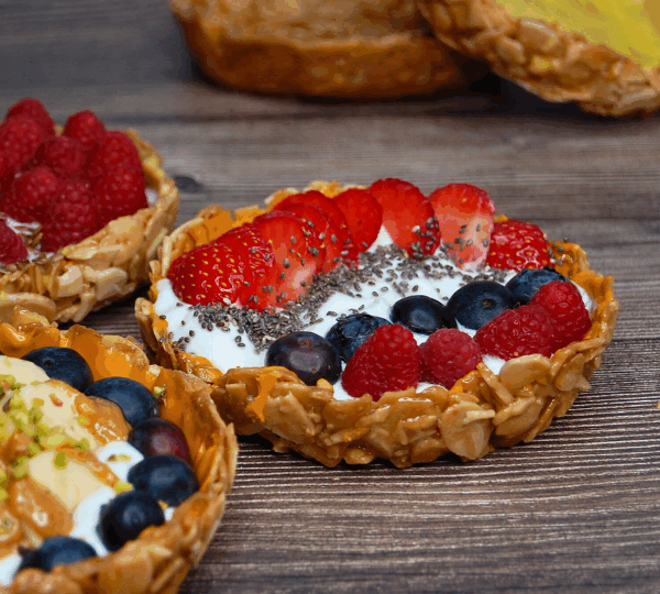 Cestini di croccante con mandorle affettate, da farcire a piacere con yogurt o gelato