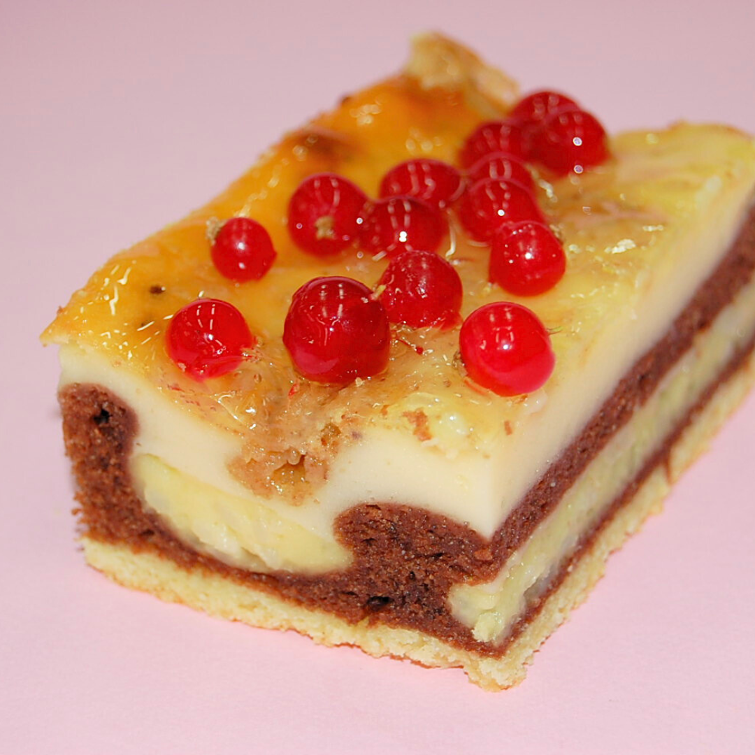 Copertura di crema: mescolare il tutto in planetaria con frusta, a media velocità fino ad ottenere una crema liscia ed omogenea. Colare la crema ottenuta sopra la base di frolla finita con le strisce alternate.