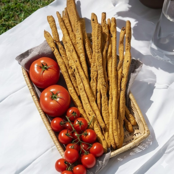 Croccanti e gustosi grissini con TOMATO SNACK ideali come snack o da servire durante aperitivi ed antipasti.