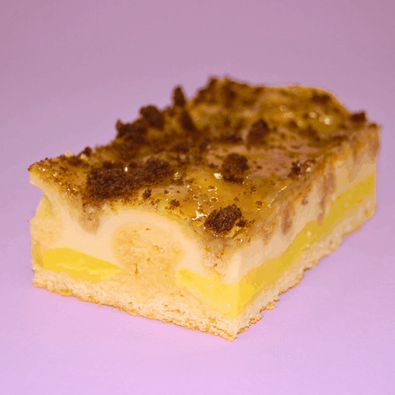 Friabile pasta frolla farcita con ripieno allo yogurt e crema di limone , cosparsa di croccante granella di frolla alle nocciole.