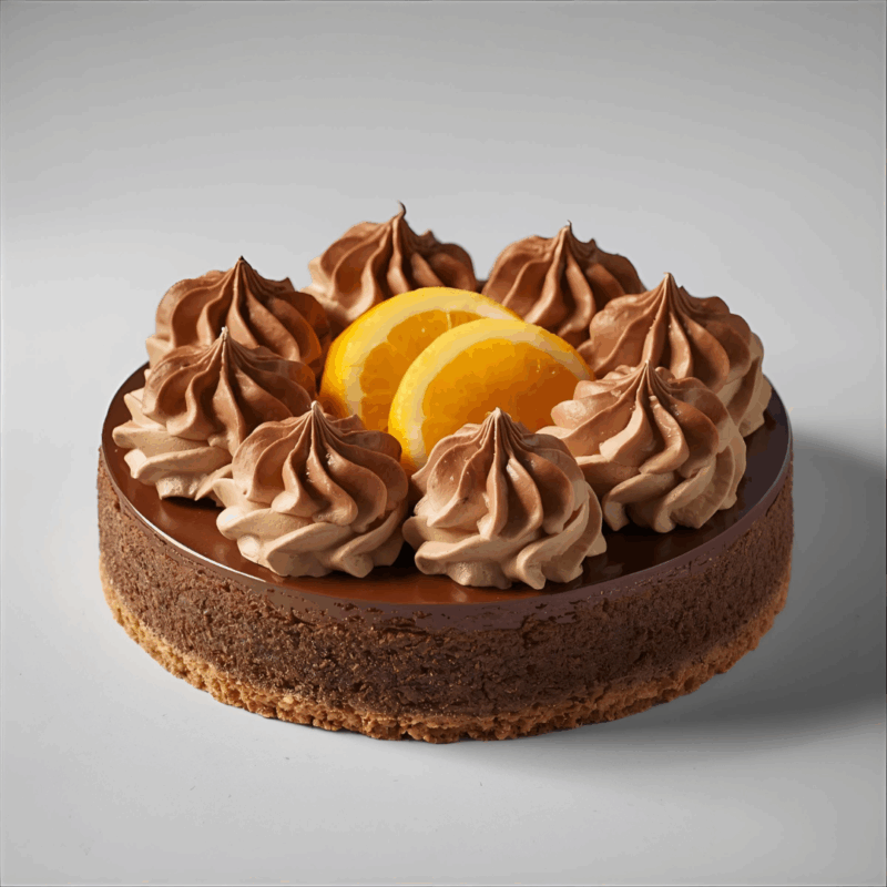 Torta con friabile base di frolla, crema all'arancia e soffice montata al cacao, glassata con crema al cacao.