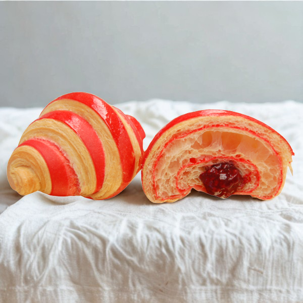 Composizione: stendere l’impasto base alla stessa dimensione dell’impasto colorato, pennellare la superficie con acqua; posizionarvi al di sopra l’impasto colorato. Stendere all’altezza di 4 mm, tagliare a triangoli e formare.