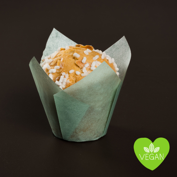 Mescolare tutti gli ingredienti in planetaria con frusta a media velocità per 3 minuti circa. Colare in stampi TULIPE (100 g ca.) Decorare con zucchero in granella e mandorle affettate.